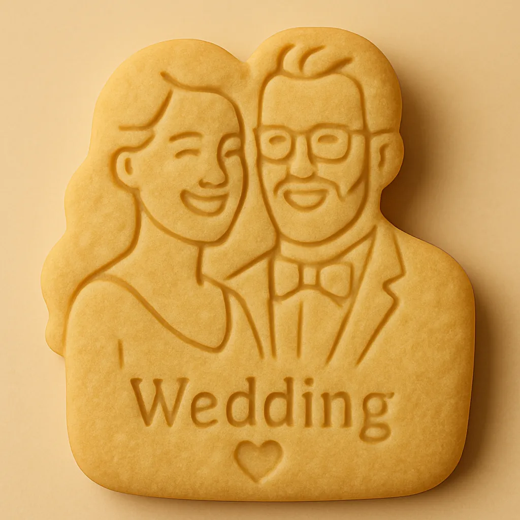 Wedding couple cookies start at $1.49/cookie. A typical 100-guest wedding (200 cookies) runs about $300–$400 depending on packaging. Both faces are on one cookie — no extra charge for the couple design.